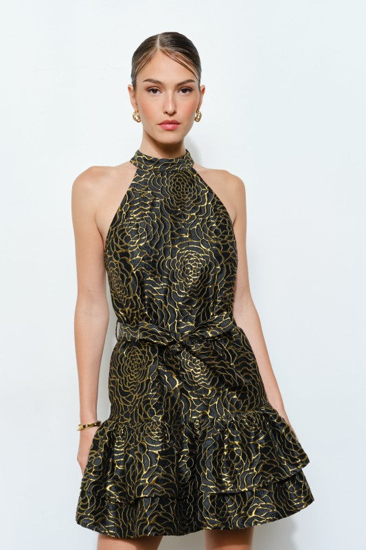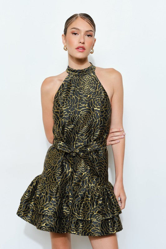 Allover metallic floral motif adds glam shine and removable self-tie belt to define the waist.