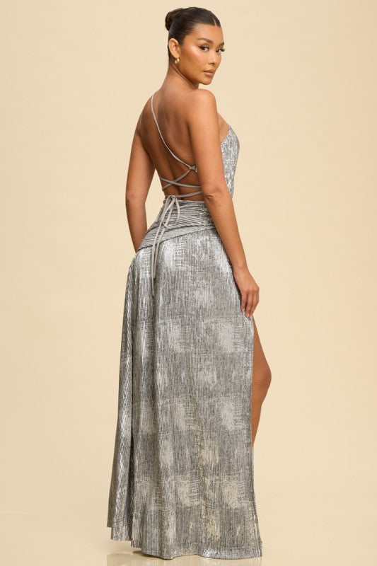 Metallic goddess asymmetric maxi dress. SELF : 52% polyester 48% silver. LINING : 100% polyester.