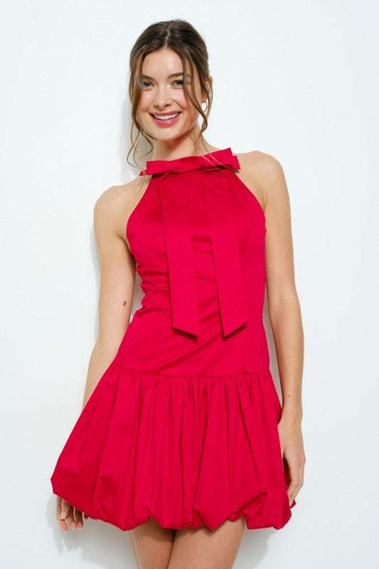 Chic high neckline with statement bow ribbon, clean-cut sleeveless silhouette for a modern feel with playful bubble hem adds volume and movement.