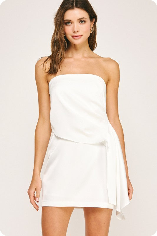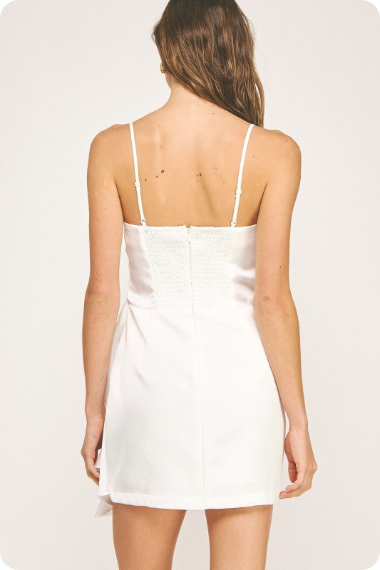 Draped pleat detail corset mini dress in satin fabric. This mini dress features a draped pleat waterfall side panel, adjustable straps that can be removed and worn strapless, underlayer with fusing, stretch smocking at back panel, mini skirt, and hidden zipper closure.