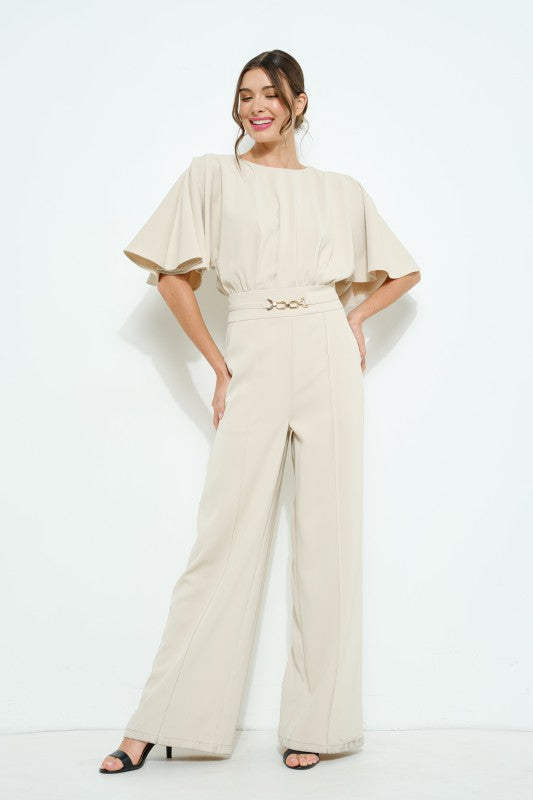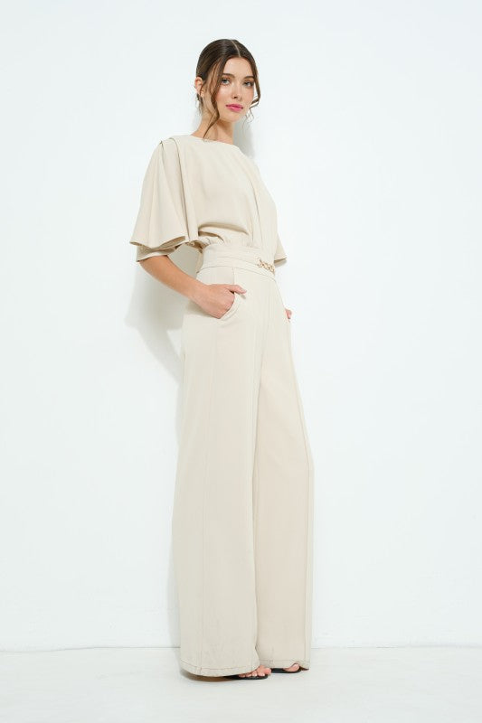 Flutter kimono sleeve buckle detail wide jumpsuit, hook-and-eye and hidden zip at back and side pockets add both style and convenience.