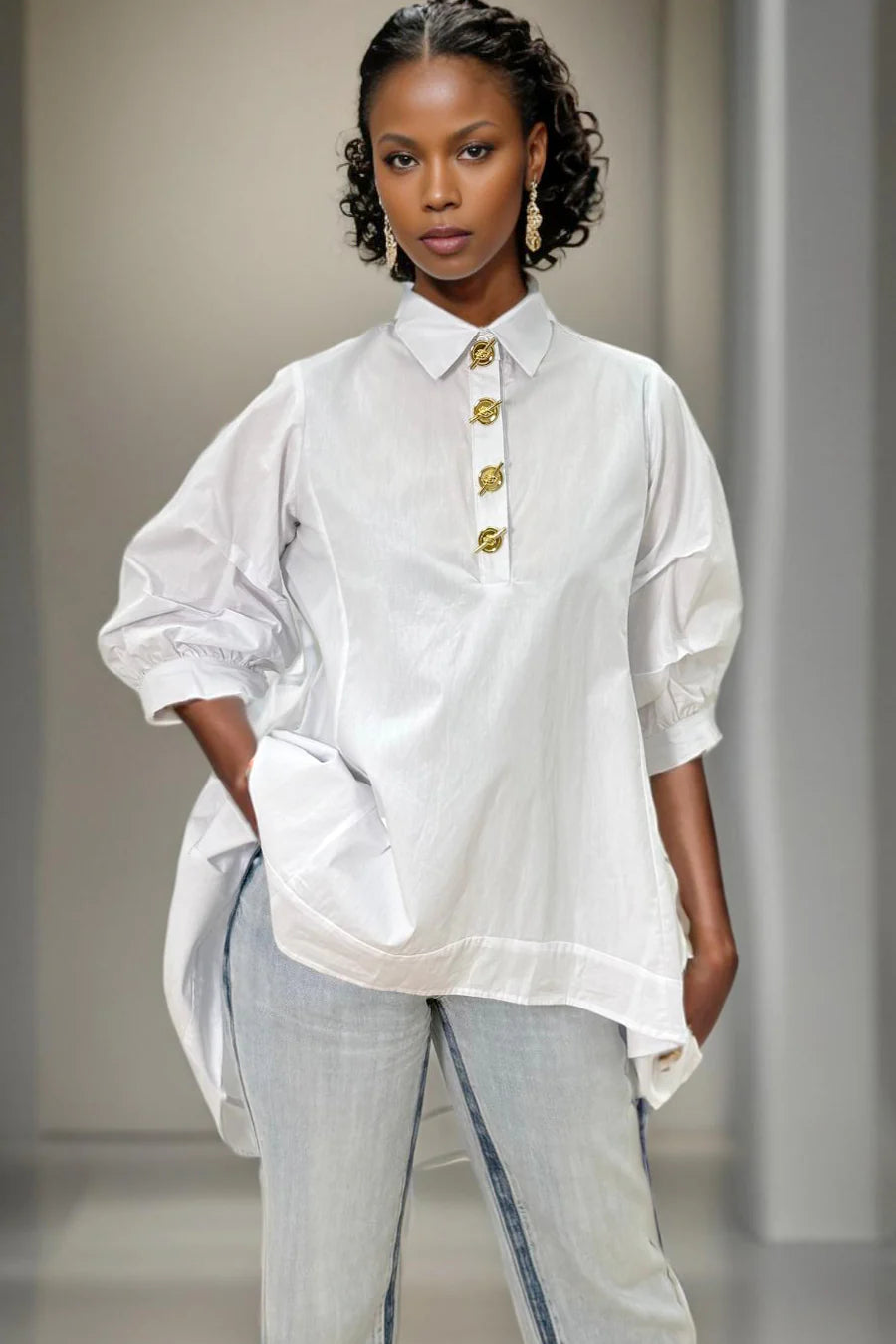 Gathered Sleeve Hi-Lo Top with Golden Buttons