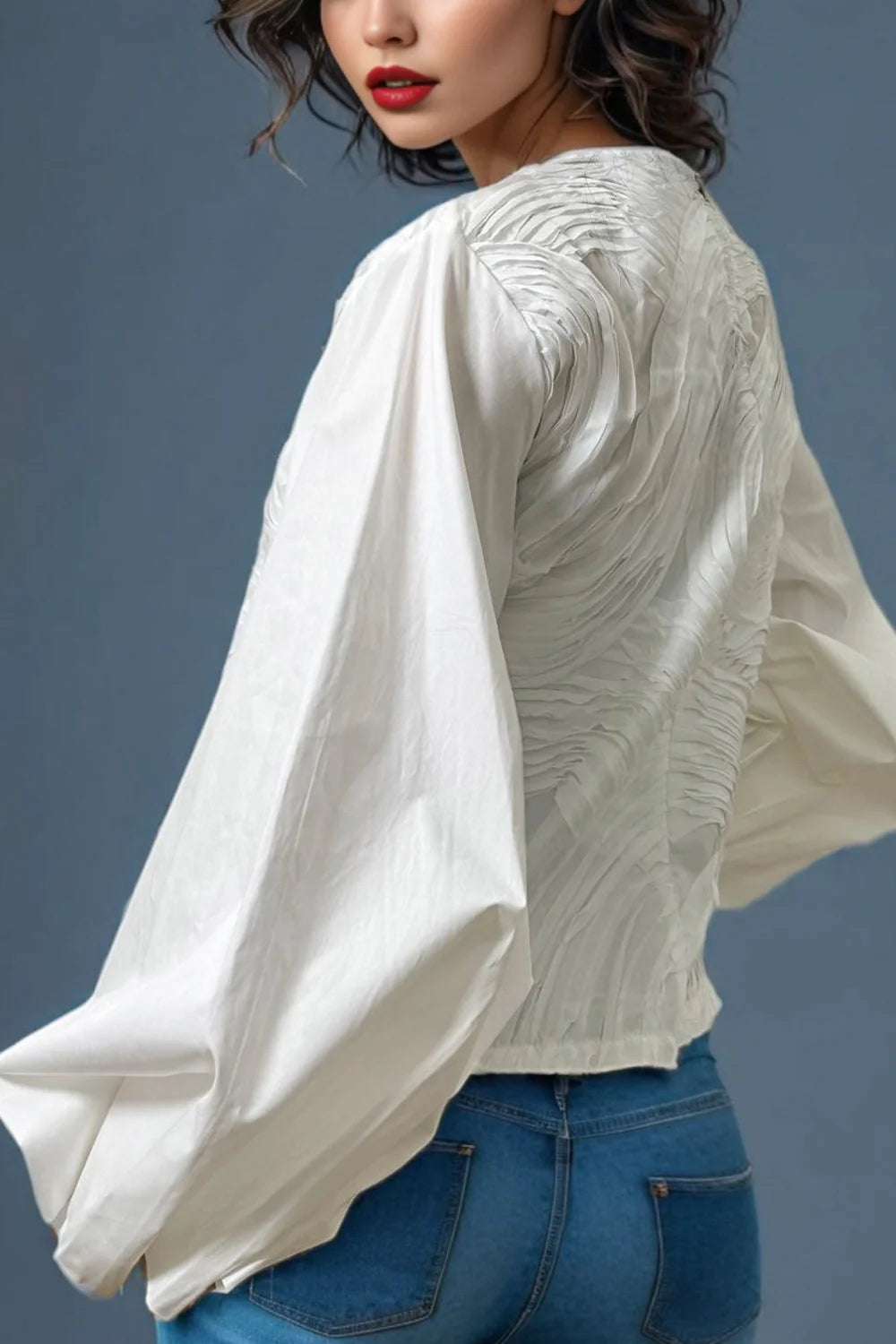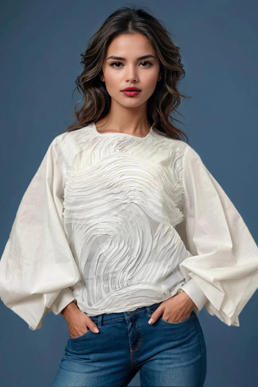 Make a statement with this lightweight pullover top featuring a round neck, elegant keyhole back, and lantern cotton sleeves with elastic cuffs. Crafted from a soft polyblend, it offers comfort with a chic textured design.